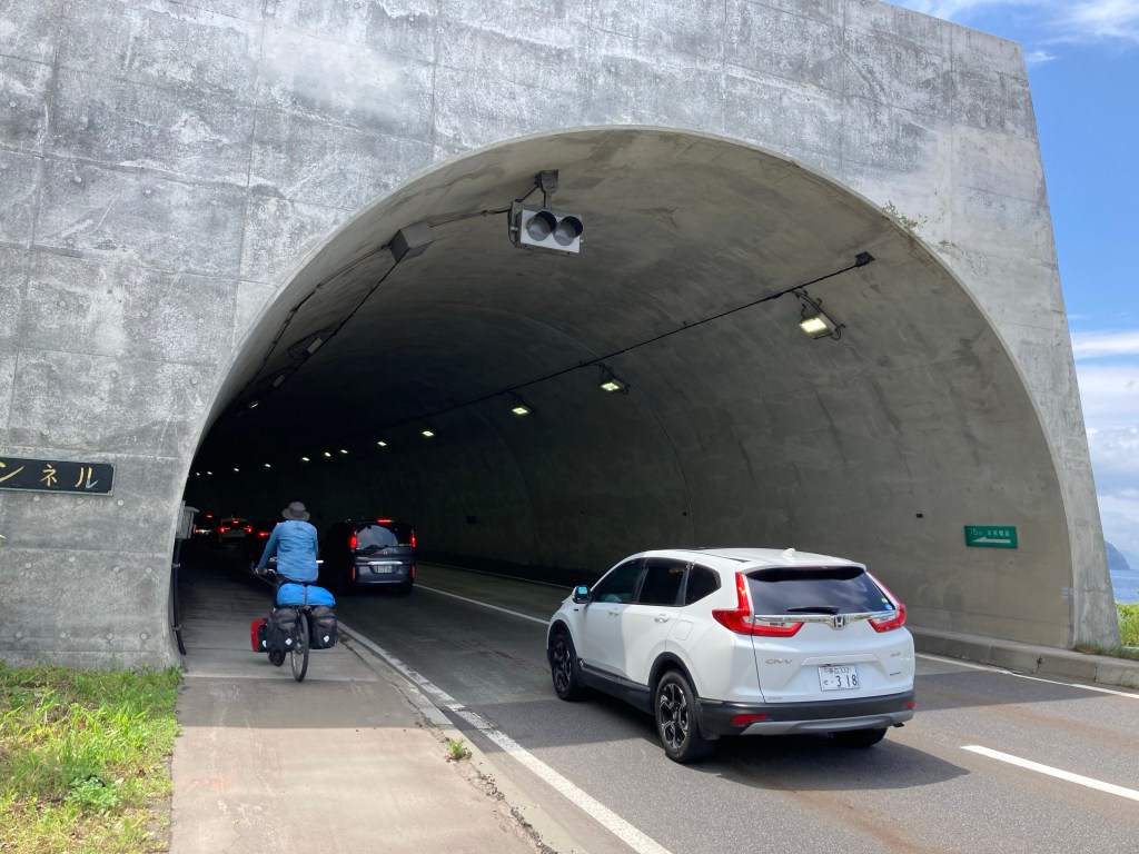 Swallowed by the first tunnel of 29 tunnels we encountered on the Shakotan Peninsula. They all had gentle gradients, and most had wide, elevated footpaths like this one and gave us a welcome break from the heat.