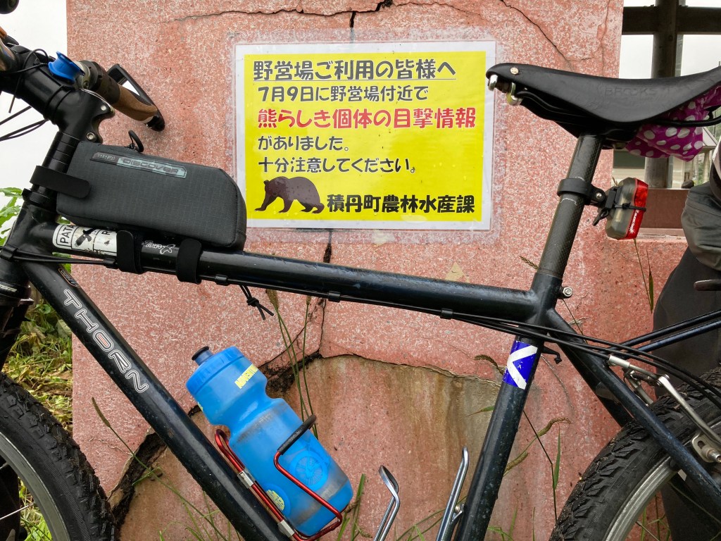 We headed off the next day in drizzle. At about morning tea time — excellent timing! — we stumbled on a farm cafe that sold us very acceptable coffee, homemade biscuits and farm produce. The rest of the day was on quiet roads; even highway 229 had little traffic when we rejoined it. We didn’t have a view of the coastline because the drizzle had morphed into fog. The sign for an onsen appeared a few kilometres before our night’s camping spot, and we stopped to bask in the various pools. At the campsite, provided free by the municipality, a warning had been posted to alert campers that a “bear-like individual” (according to Google Translate) had visited on July 9. Hokkaido’s forests are home to a subspecies (Ursus arctos lasiotus) of Eurasian brown bear. I’m happy to see one — from a distance.