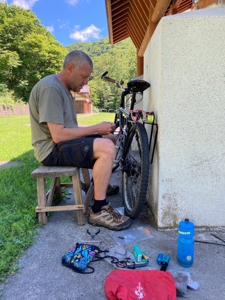 At Sakazuki: no food (because a bear took it), still suffering from the previous day’s sunstroke … and a back brake cable still needs replacing.
