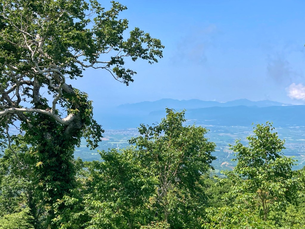 Rested after a day indoors in Iwanai, we left the coast and began the eastward leg of our warm-up circuit. We were granted a kilometre of flat riding, and then began a 23 km climb for an 860 metre gain in altitude. We laboured in the heat, sun beating down on us, and heat radiating up from the bitumen. The temperature was 30 °C by 10 am, and humidity about 90%, with no shade from the tiered vegetation around us.