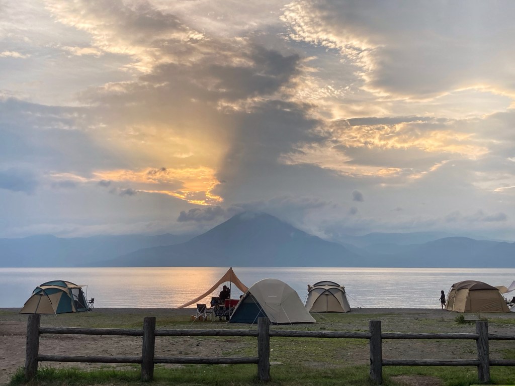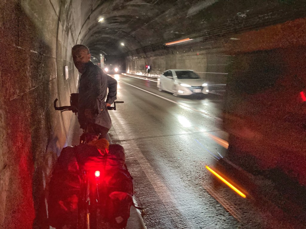 The next day’s ride saw a return to tunnels. There were only 3, but 2 of them were awful. As we approached Lake Shikotsu, we joined highway 276, which we discovered — about 100 metres in — is a truck route to the port of Tomakomai. The highway lanes are narrow, only just accommodating the trucks. We lost our shoulder to ride on at the first tunnel. It was 1.6 km long and had only a bike-width footpath for pedestrians, too narrow to ride with laden touring bikes and the occasional obstacle protruding from the tunnel wall. It was a scary walk through with the bikes. The second tunnel was the same, but only 335 metres long, so we decided to sprint through on the bikes. That was more terrifying than the first one. We stopped on the eastern end to calm our nerves, eat lunch and psych ourselves up for the last tunnel. What a wonderful surprise that it had a wide footpath that continued all the way to our campsite on the shore of Lake Shikotsu.