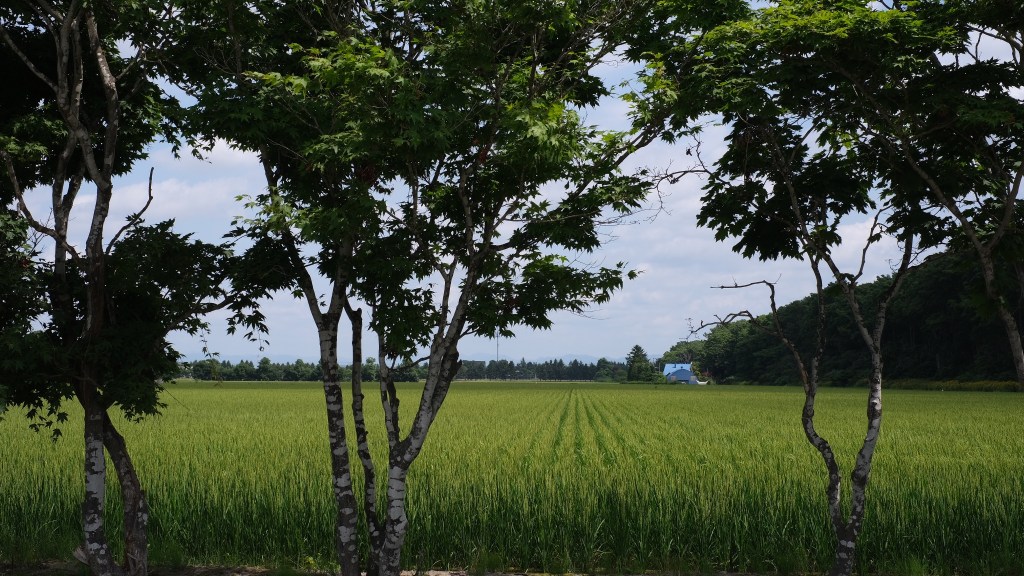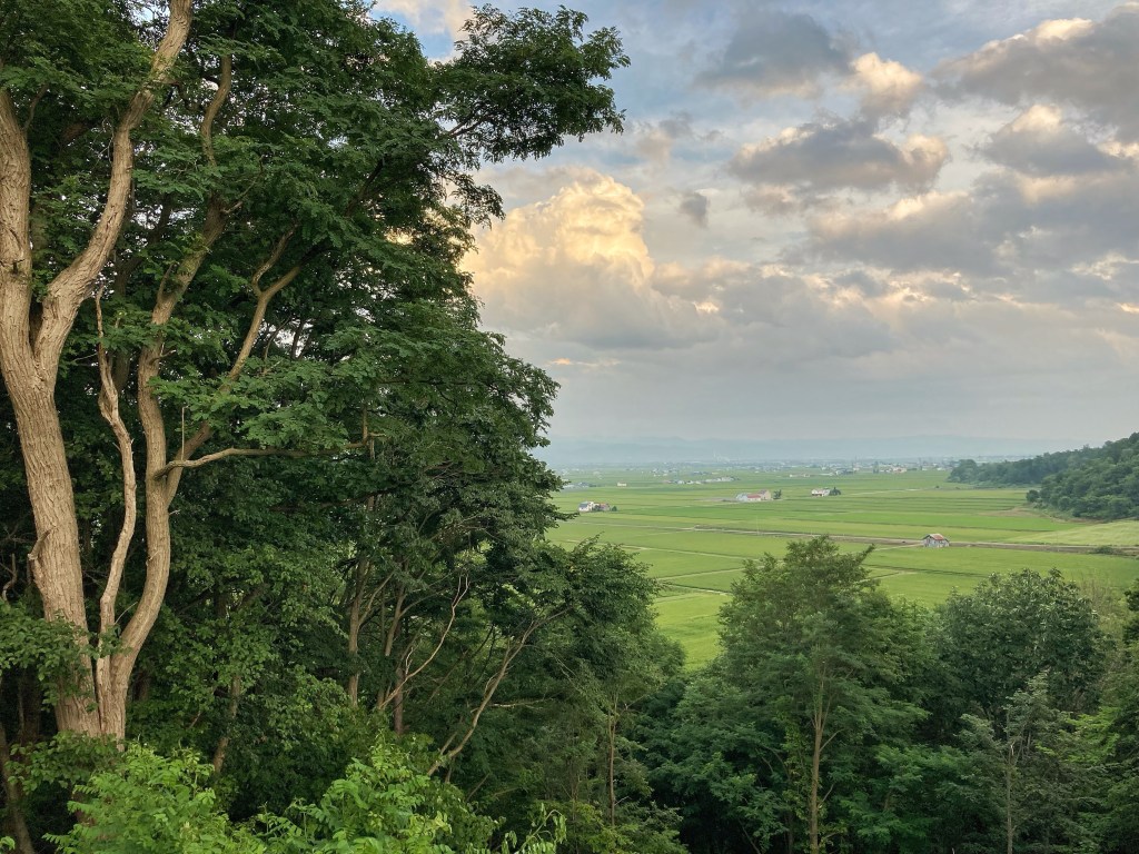 Across the Ishikari valley, roads criss-crossed each other in neat grids, and within them, squares of neat fields furnished rice, wheat or barley, rice, potatoes and other vegetables, flowers, and rice. A network of irrigation channels meant water could be spread across some fields while others were kept dry. The floodplain is flat and wide here, as the Ishikari nears its mouth.