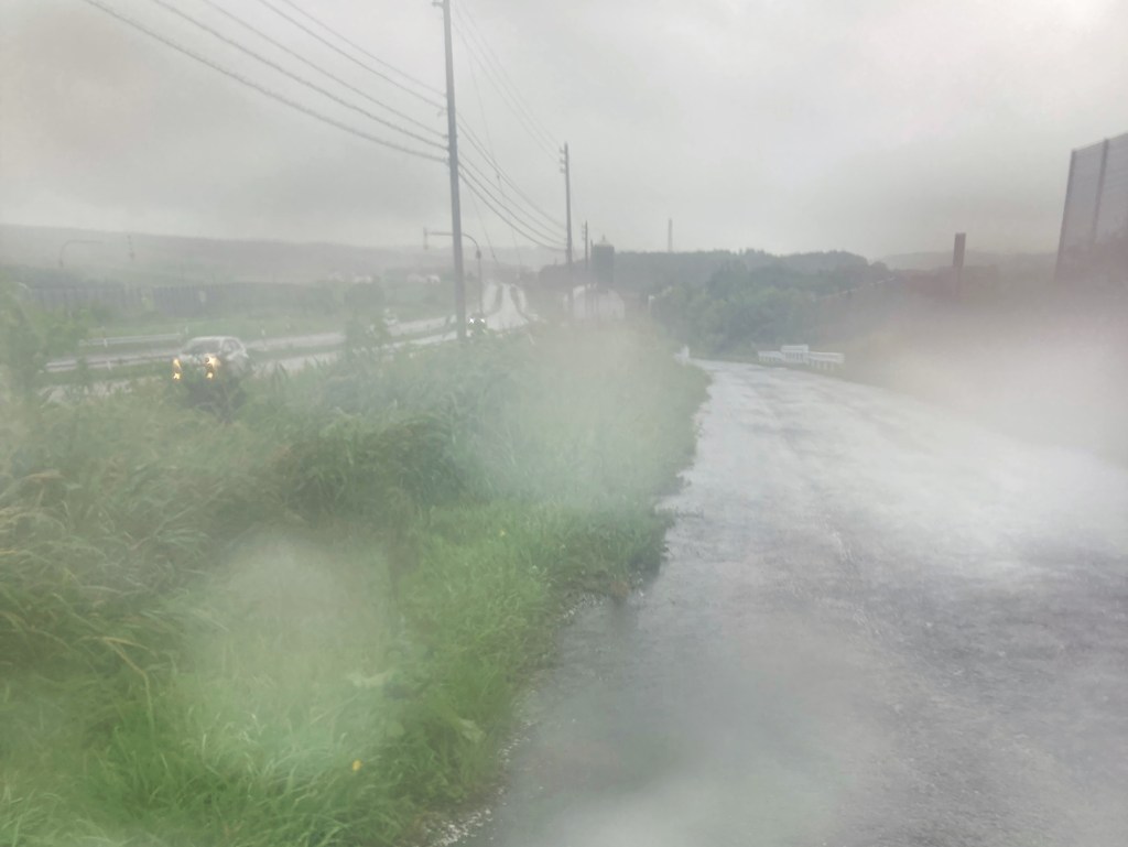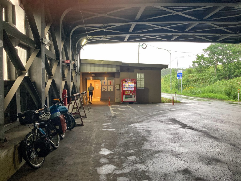 The next morning, under leaden skies and swirling winds, we set off on the last leg to Wakkanai, weather reports and signs above the road warning of flooding rivers, landslides, lightning and heavy rain. Every river and stream we crossed was surging with mud-saturated water. The first downpour of the day arrived as we pulled into the Kaigen parking shelter. What a blessing this ugly concrete bunker was! As well as providing under-cover parking for motorists, it came with drinks dispensers, squeaky-clean toilets with built-in heated seats and bidets, and a poster advertising vehicle support for minor repairs for cyclists riding by.